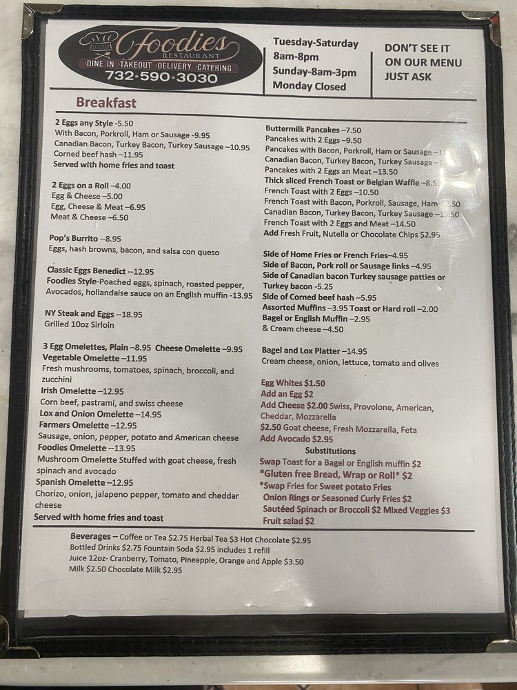 Welcome to Foodies, a delightful American breakfast and brunch spot nestled in Englishtown, NJ. Known for its cozy, welcoming atmosphere, this unclaimed gem offers an expansive menu that caters to various tastes, including many vegetarian options.